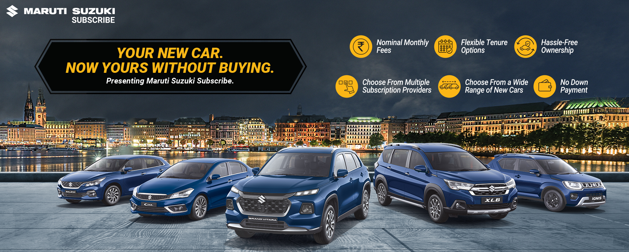 Maruti Suzuki Subscribe enables all customers to enjoy driving their preferred Maruti Suzuki cars without having to deal with all the financial responsibilities that come with owning a car.All you need to do is opt for a monthly subscription plan at a fixed monthly fee, which includes the routine maintenance and insurance costs, and choose a flexible tenure. At AVG in, , Kottayam, all Hatchback, Sedan, SUV, the MUV models line-up includes Baleno, Invicto, EVitara, Jimny, Ciaz, Ignis, Fronx, Grand Vitara, XL6. Here, you will enjoy Maruti Suzuki Subscribe benefits such as: